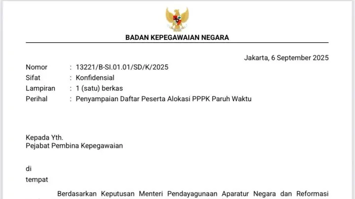 Surat BKN bernomor 13221/B-SI.01.01/SD/K/2025 tertanggal 6 September 2025 itu diterima Pemkot Parepare pada Senin, 8 September 2025 sekitar pukul 12.00 WITA.