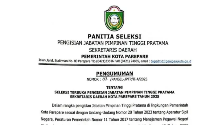 Narasisulsel.id Parepare – Pemerintah Kota Parepare resmi mengumumkan Seleksi Terbuka Jabatan Pimpinan Tinggi Pratama untuk posisi Sekretaris Daerah (Sekda) Kota Parepare.